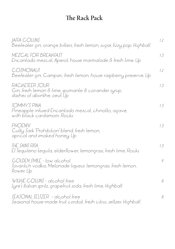Seasonal house-made fruit cordial, fresh citrus, seltzer. Highball. Alcohol free