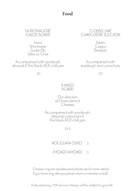 Our selection of Charcuterie & Cheeses. Accompanied with sourdough, almonds, cornichons & The Racks HOT chilli jam.